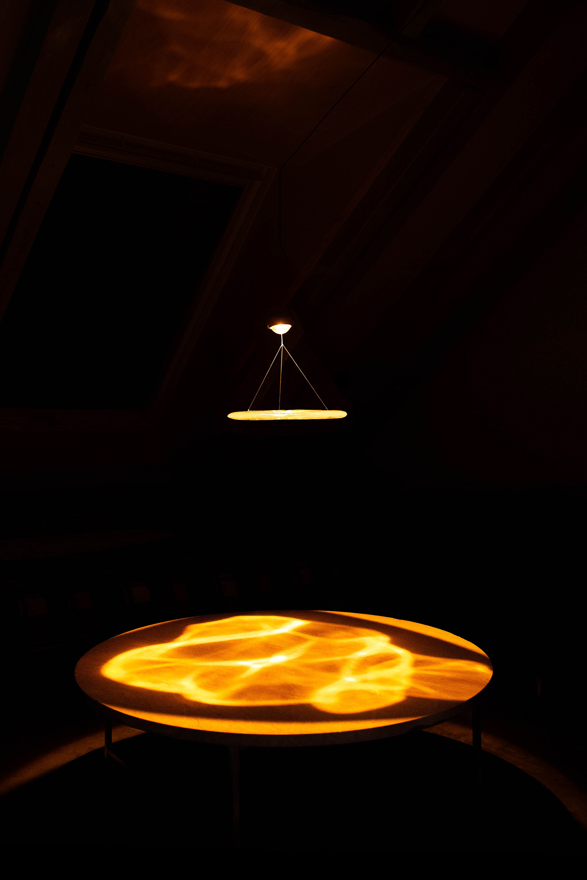 This lamp is the result of a technical exploration into the optical qualities of lenses. Starting with CNC-cut and polished acrylic glass, I experimented with distorting the material by grinding the surface manually to create a more organic form. The outcome is a floating, pebble-shaped lens that projects a caustic pattern onto the surface below.