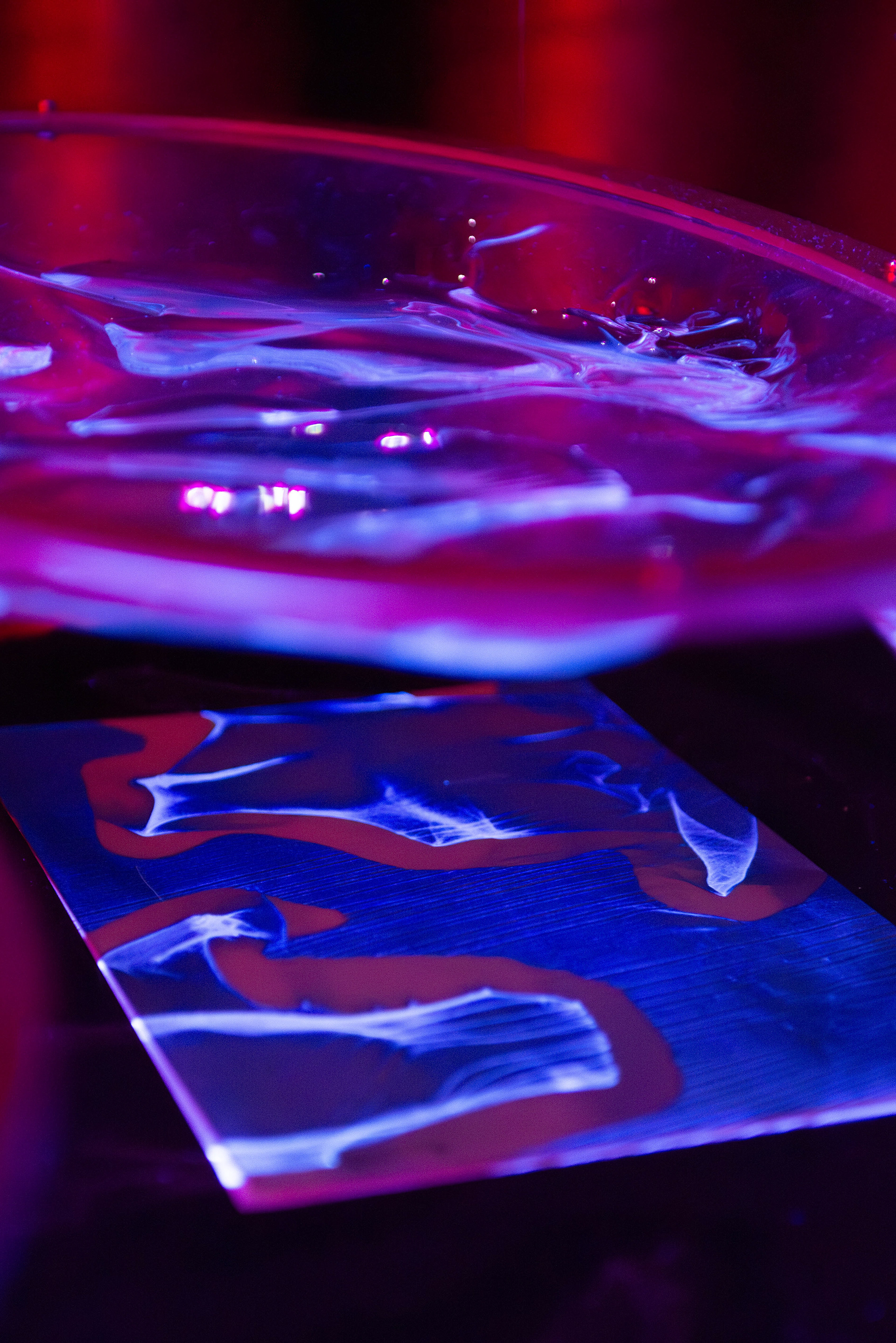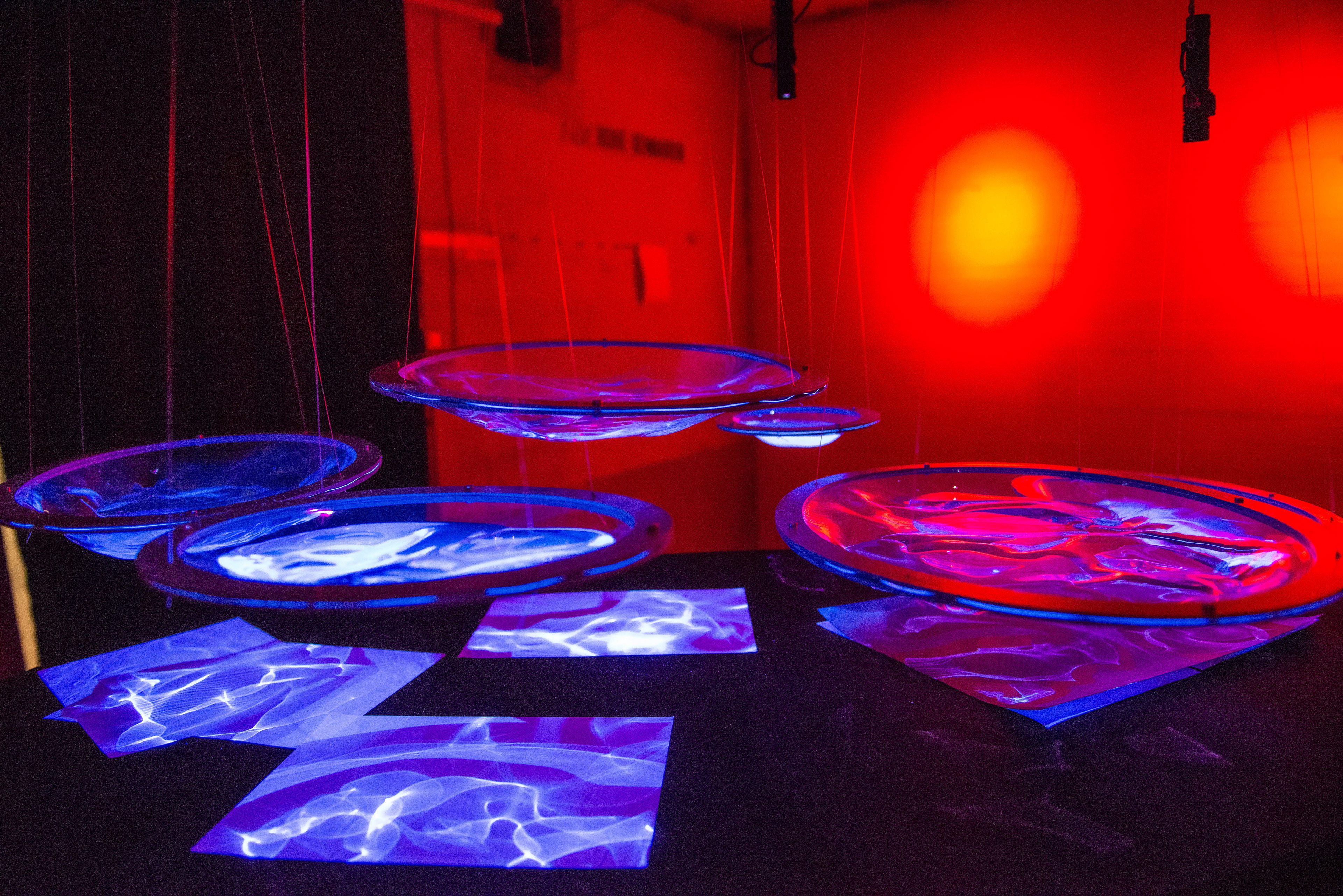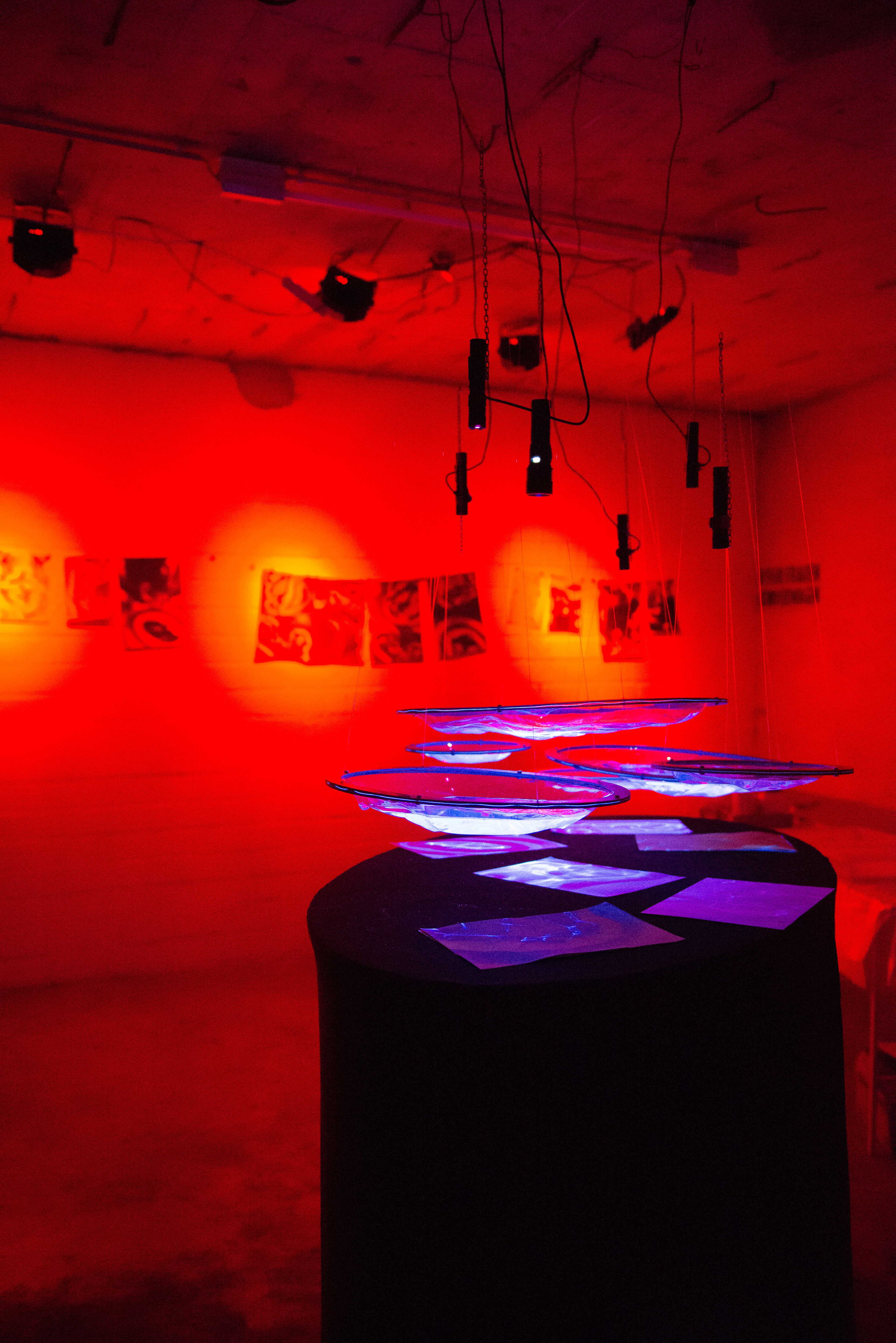 The installation “Dunkelkammer” (ger. “dark room”) produces unique photographs of light refracted through water. The liquid lenses, project caustic patterns that are captured as photograms on UV-sensitive paper.