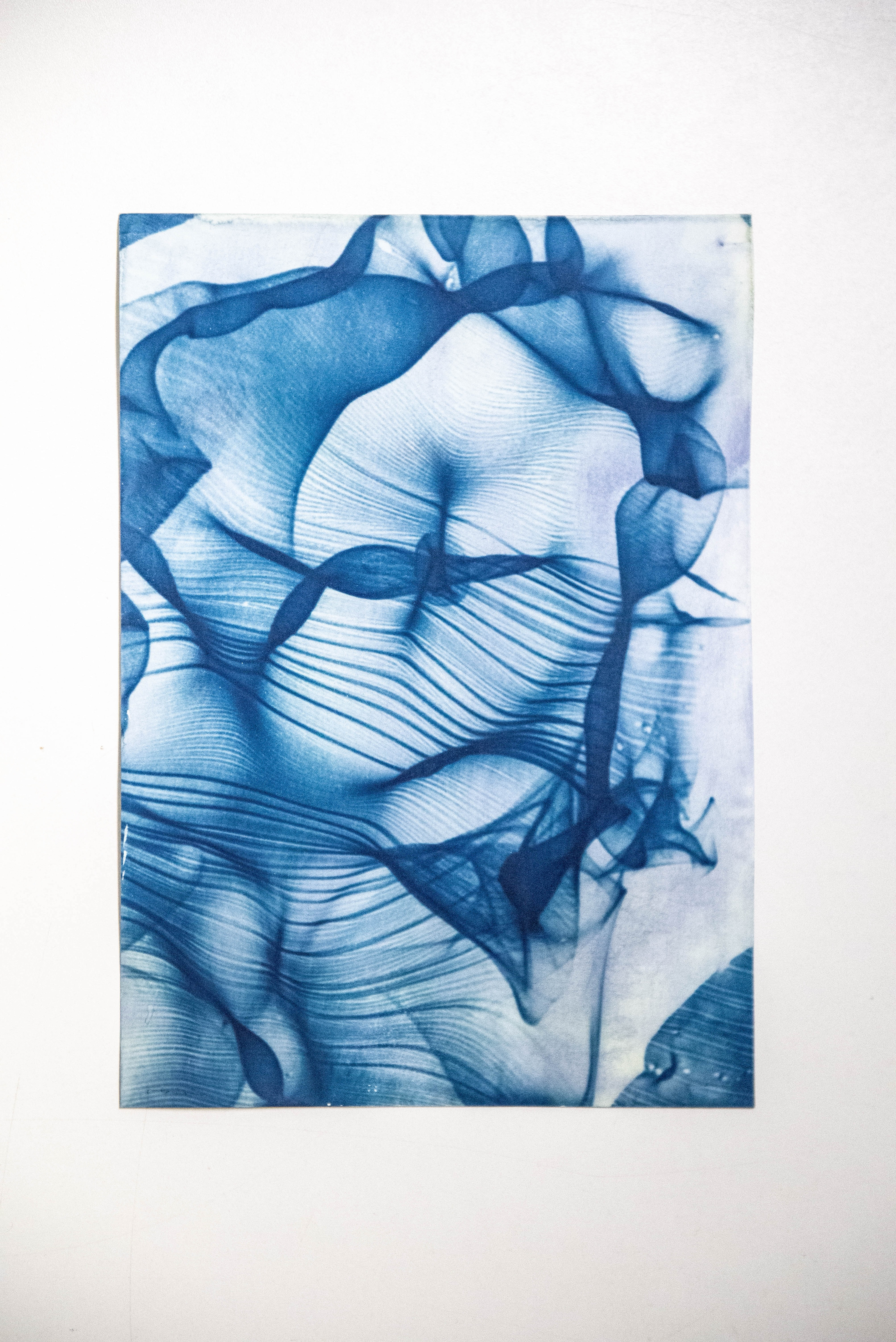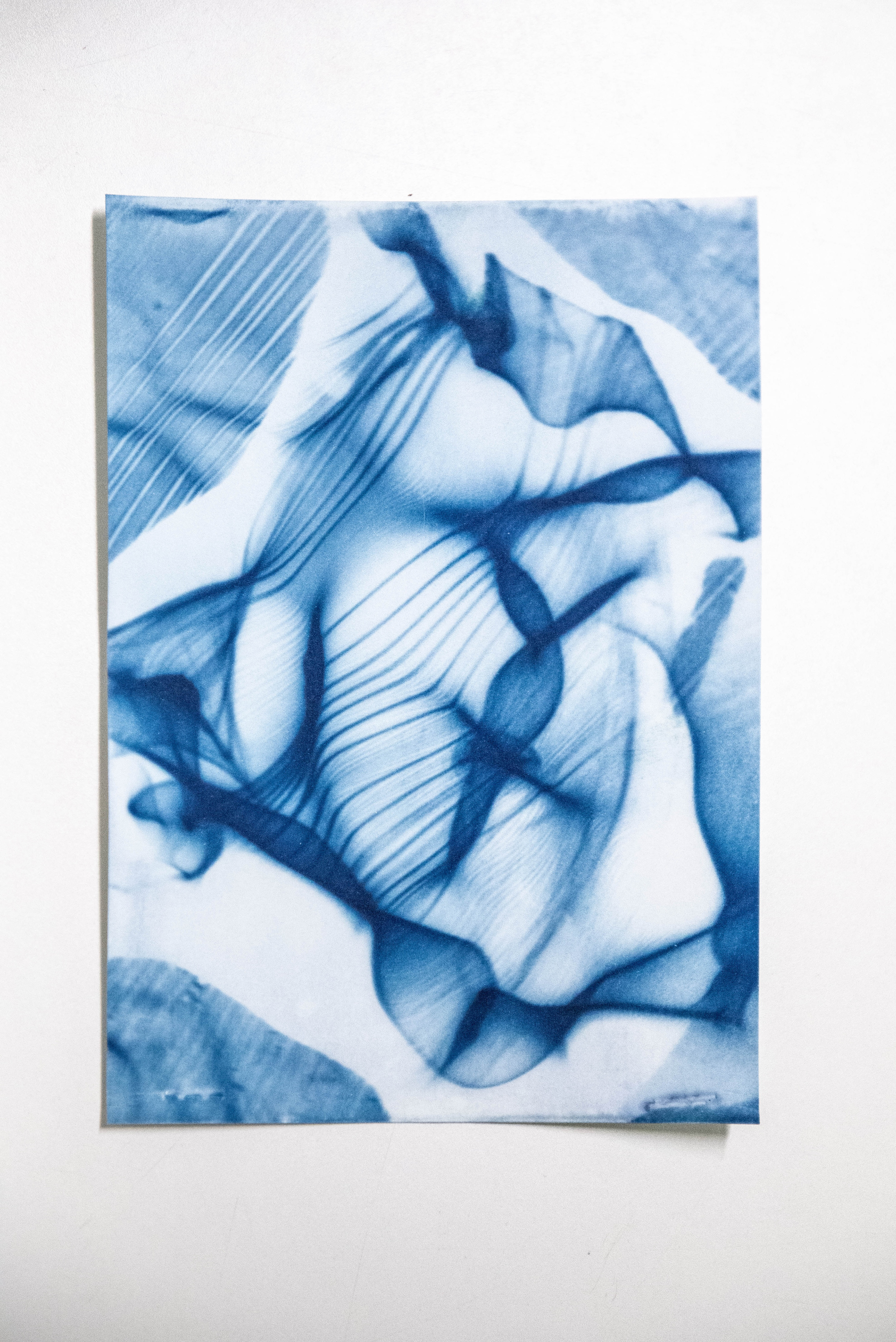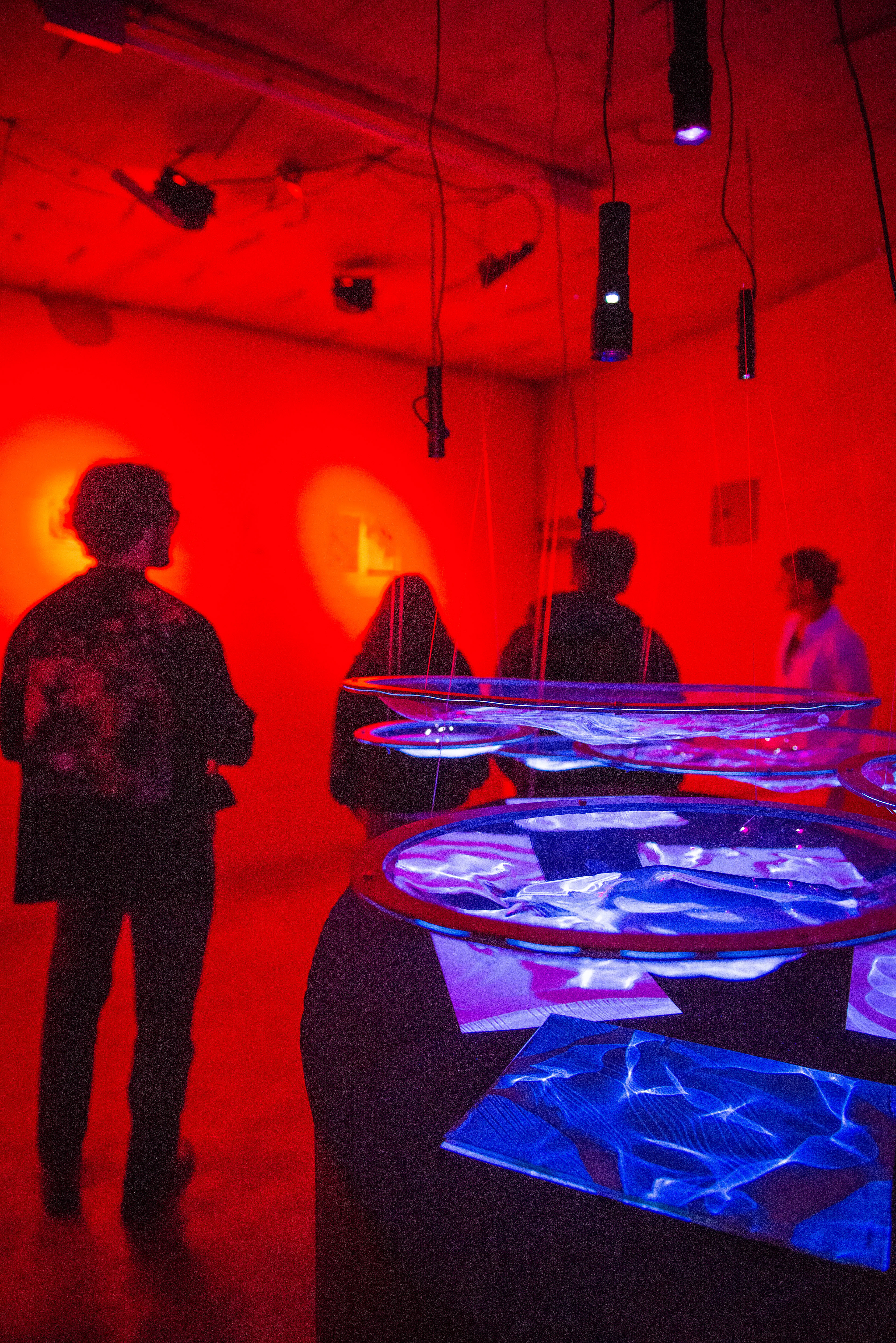 The installation “Dunkelkammer” (ger. “dark room”) produces unique photographs of light refracted through water. The liquid lenses, project caustic patterns that are captured as photograms on UV-sensitive paper.