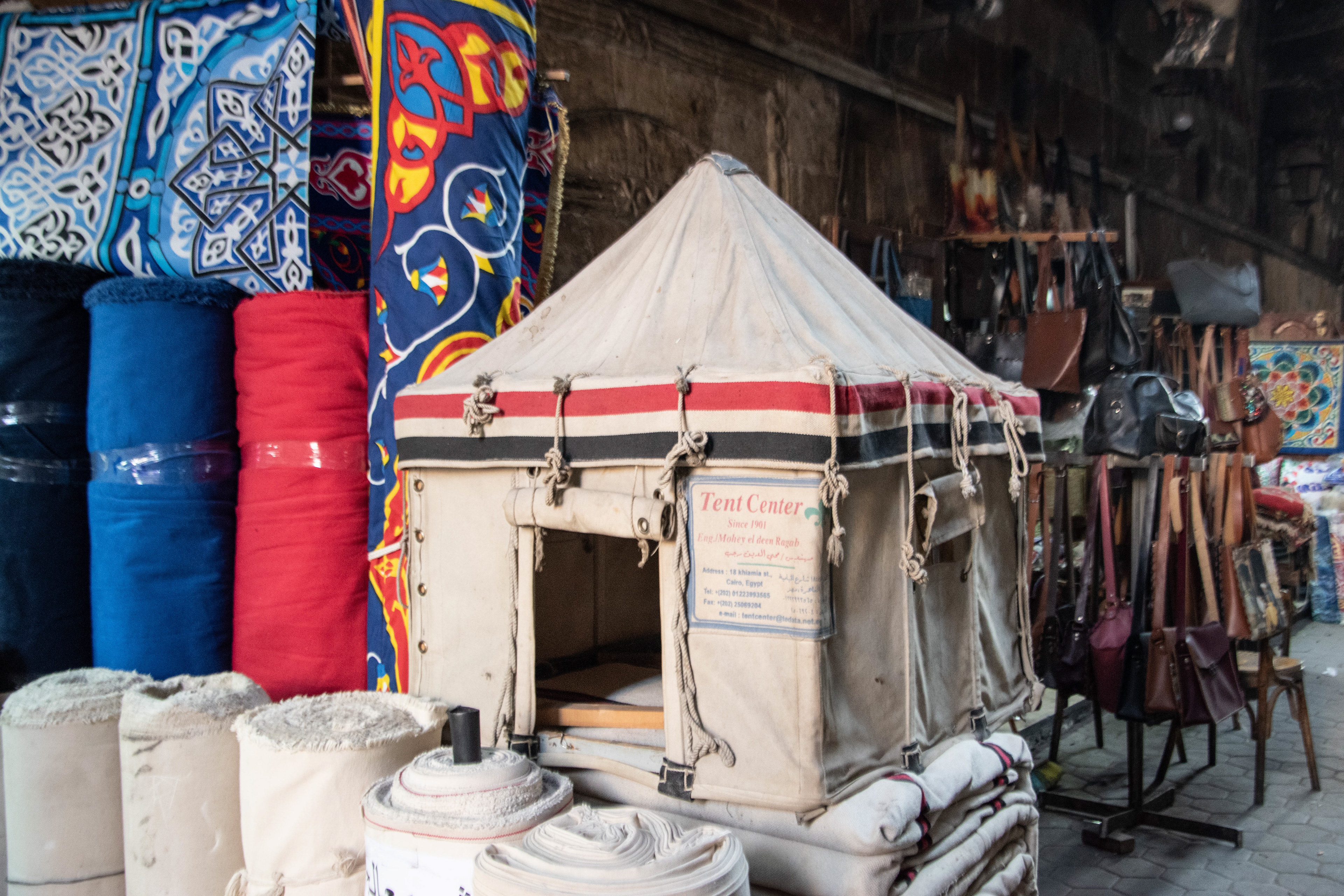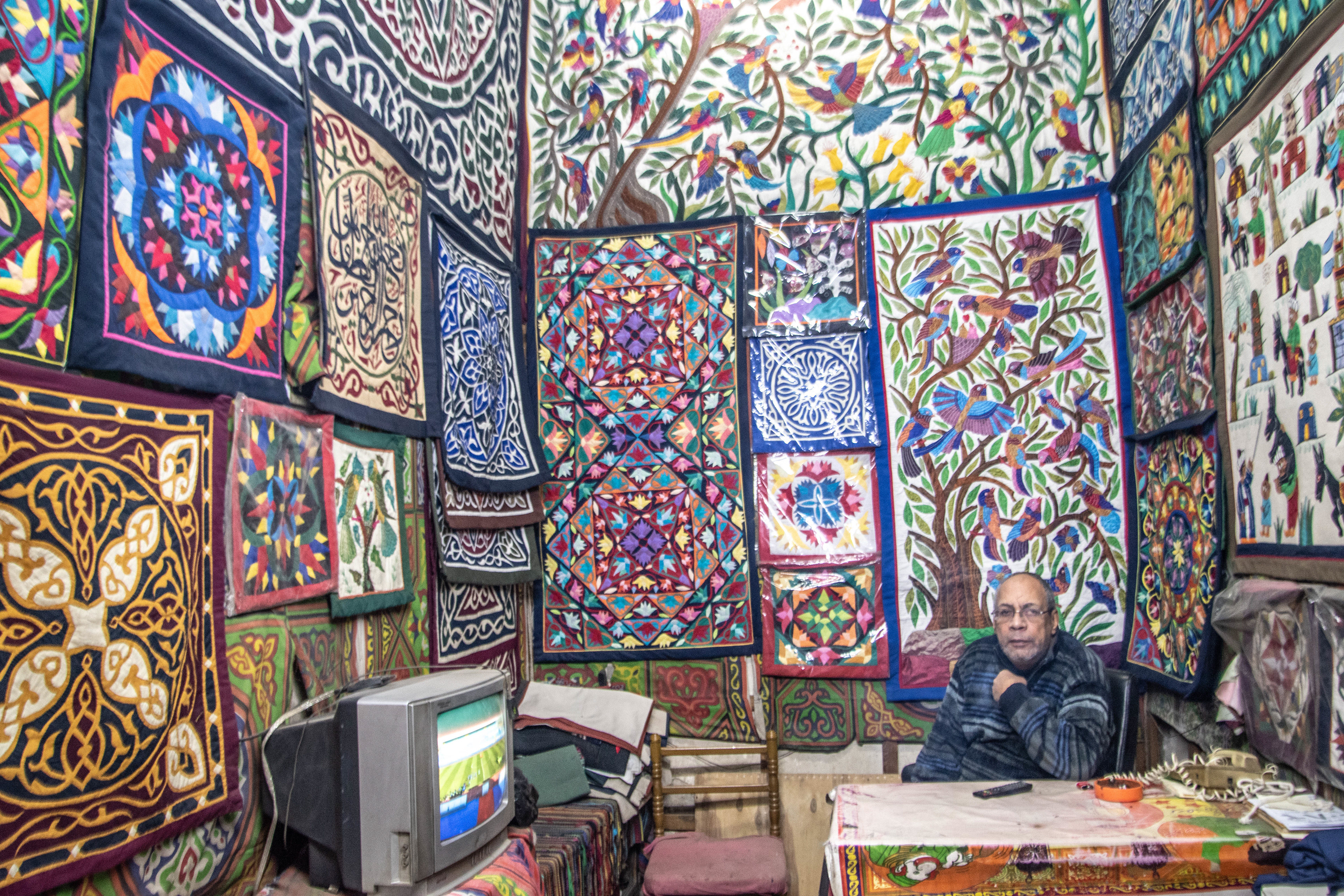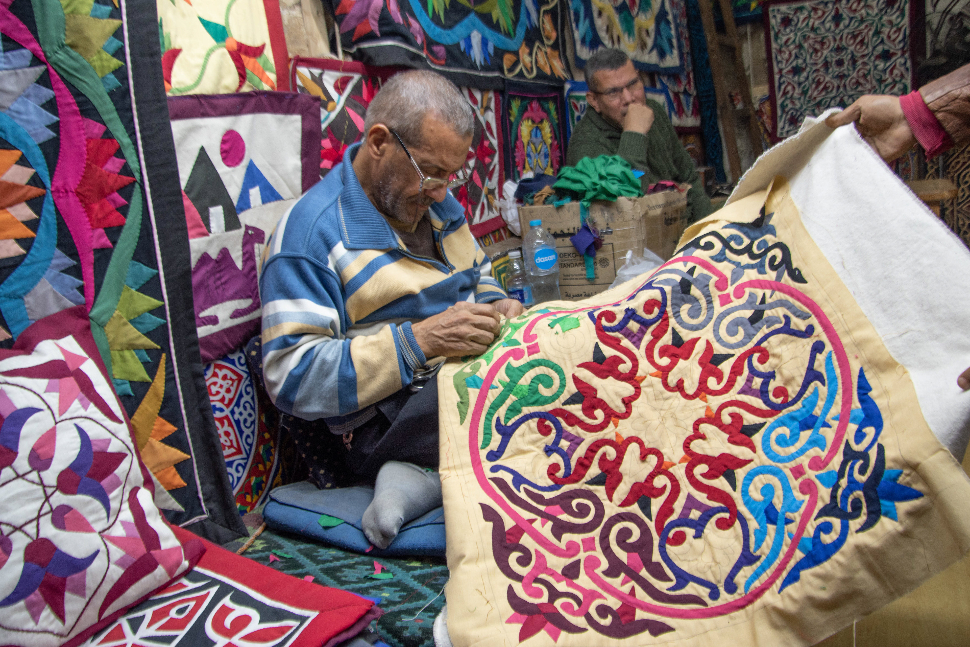 Tent-making is a traditional craft that is passed down from father to son. Bedouin tents are built up out of straight pieces of cloth which have strings attached at the edges to tie them. They have specific decorations which are made of simple geometric shapes or complex patterns which are stitched onto a cotton fabric by hand. This technique is called Khayamiya.