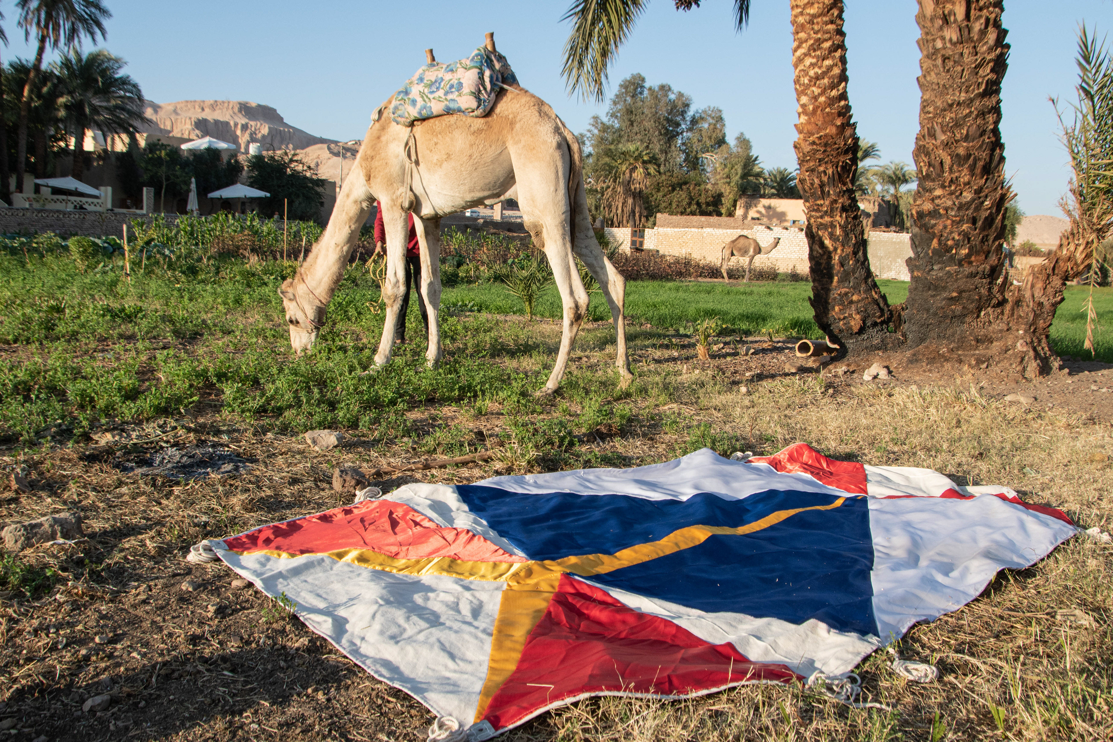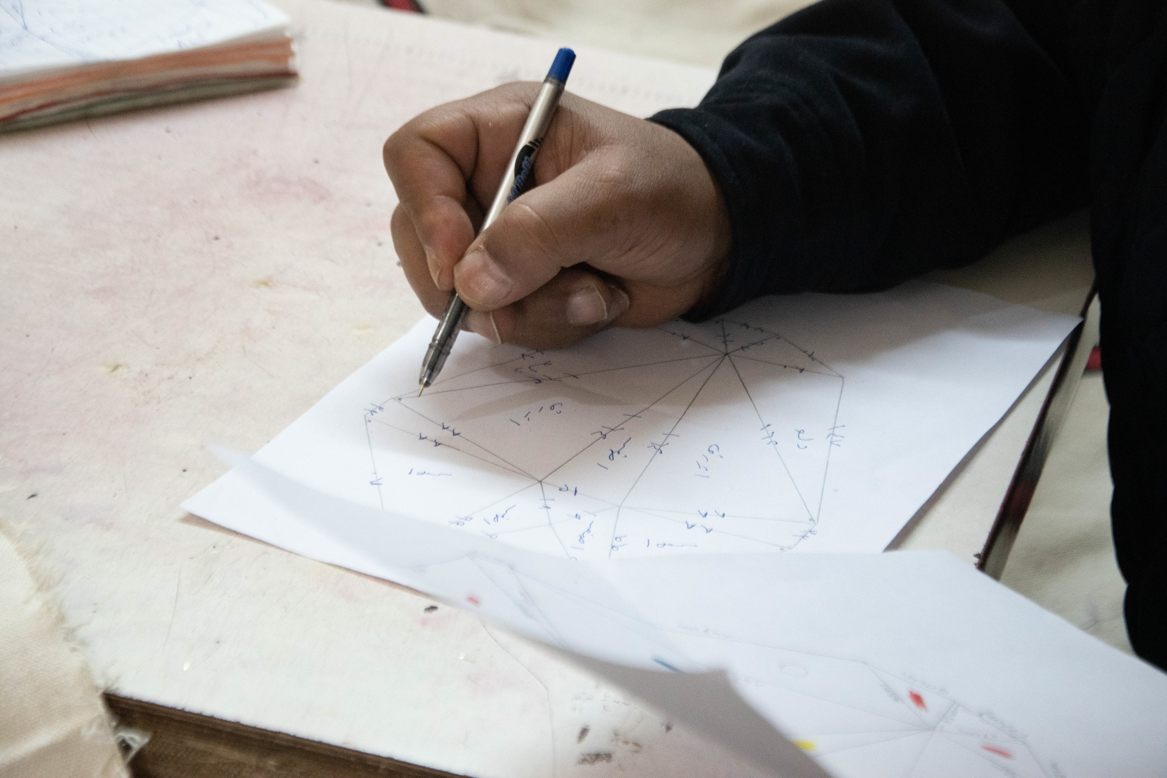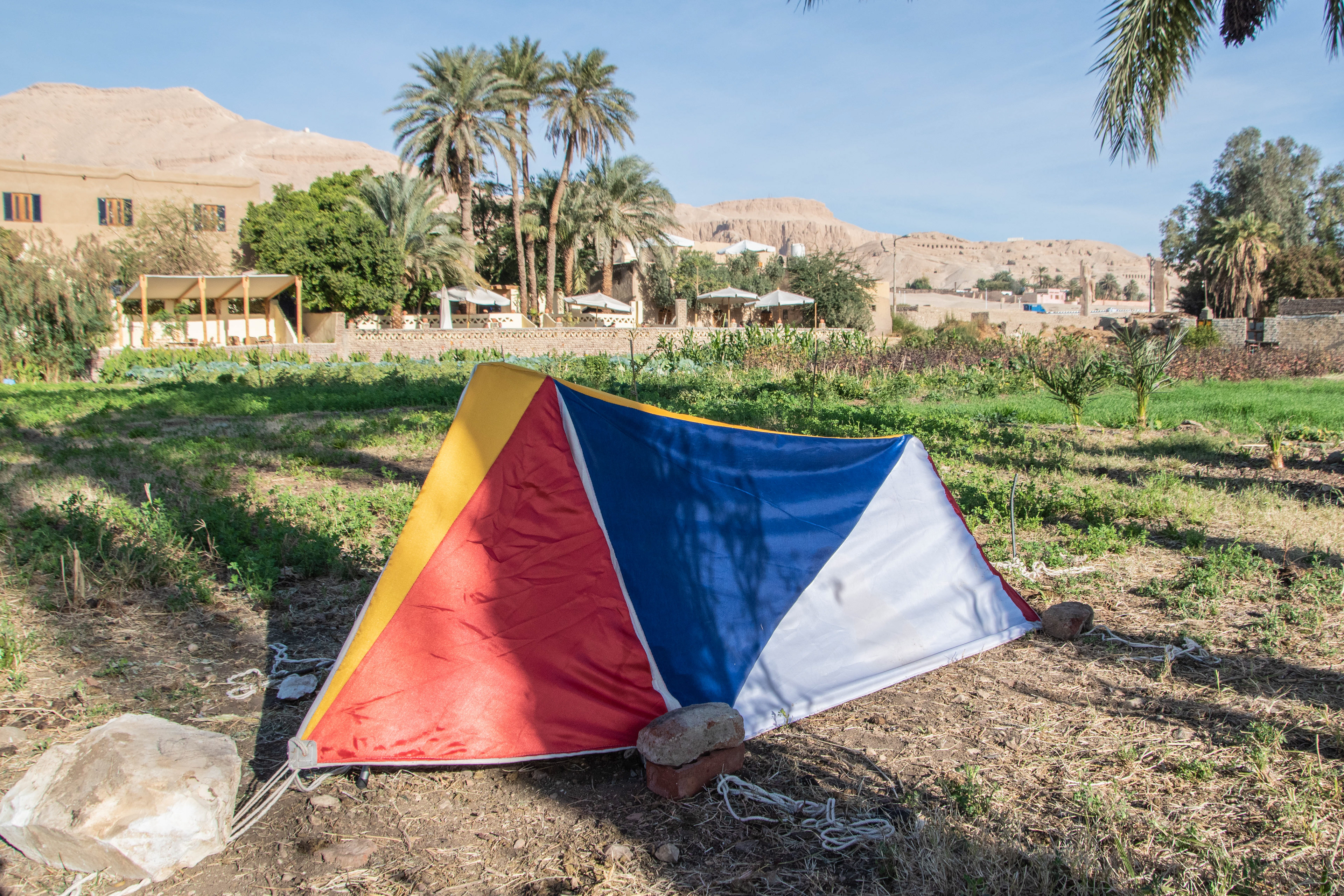 I was interested in the simple geometric patterns which are usually made of basic colours like red, blue, yellow, white, and green. Also, the multi-functionality of a simple piece of cloth fascinated me. After learning about the craft of the tent makers I designed a tent and had it produced by them in the traditional way. It consists out of one piece of fabric and can host one person. As stakes, I use my camera tripod which I would have with me on a trip anyway so no further objects are needed. Furthermore, the fabric can be used as a picknick blanket or sunshade.
