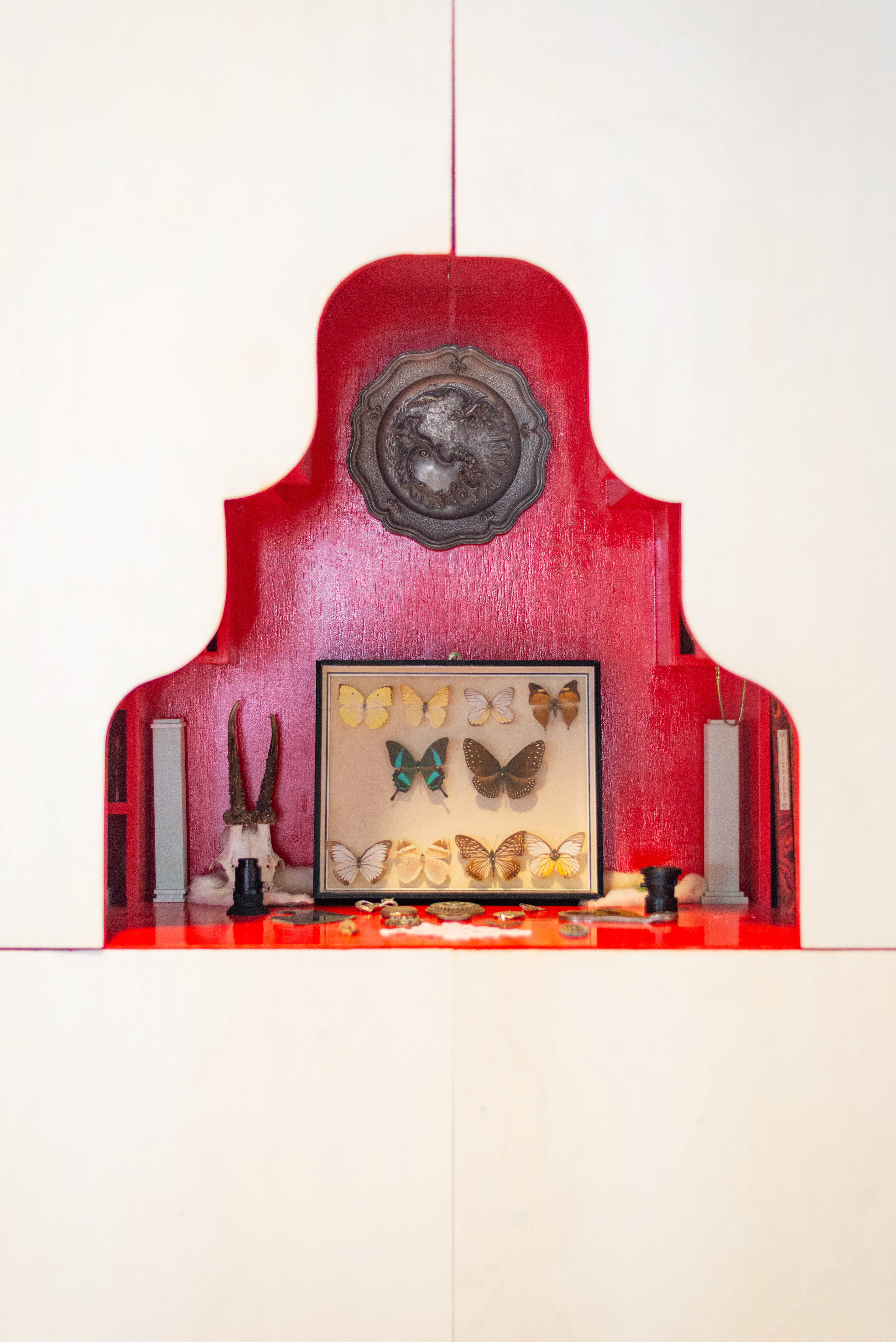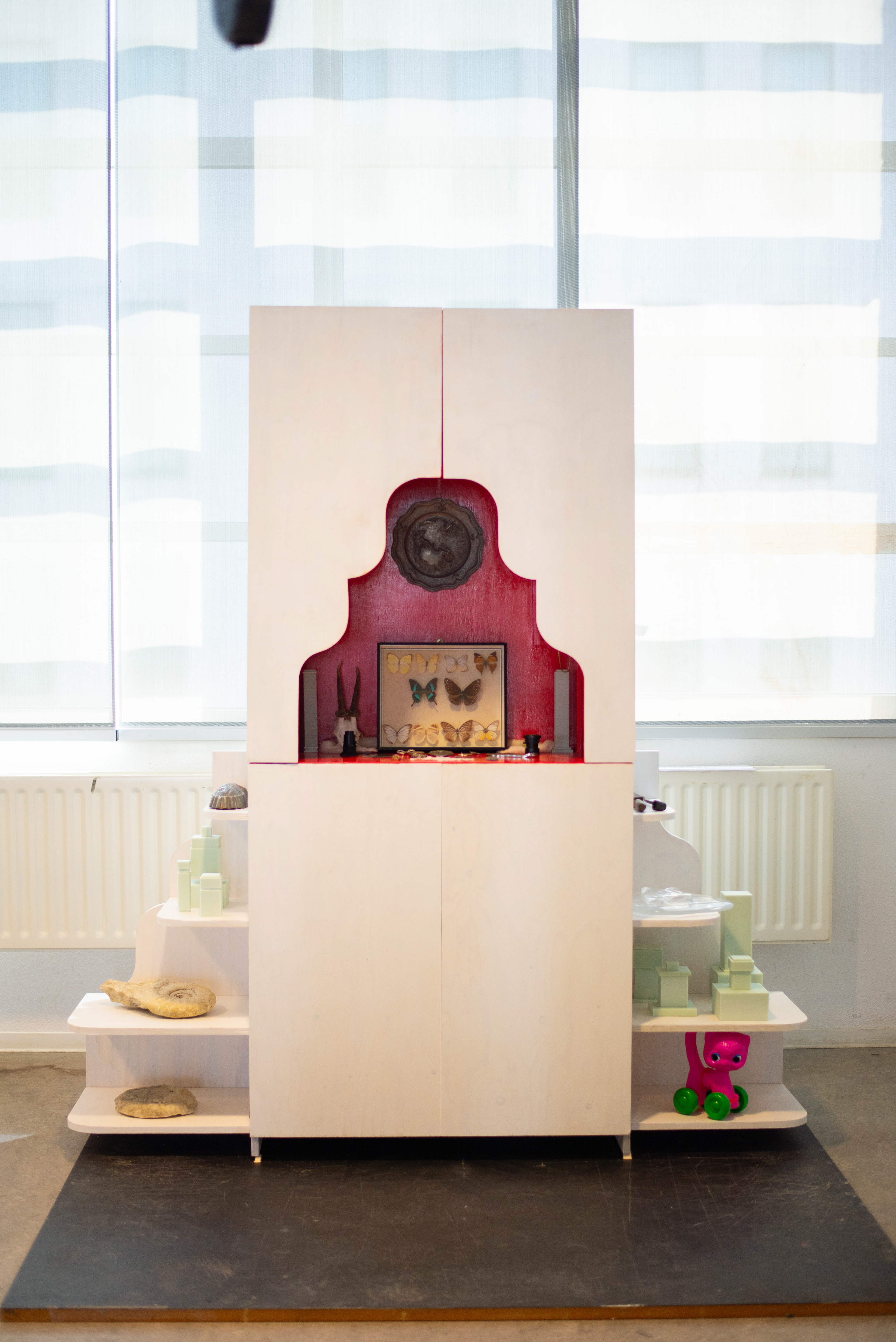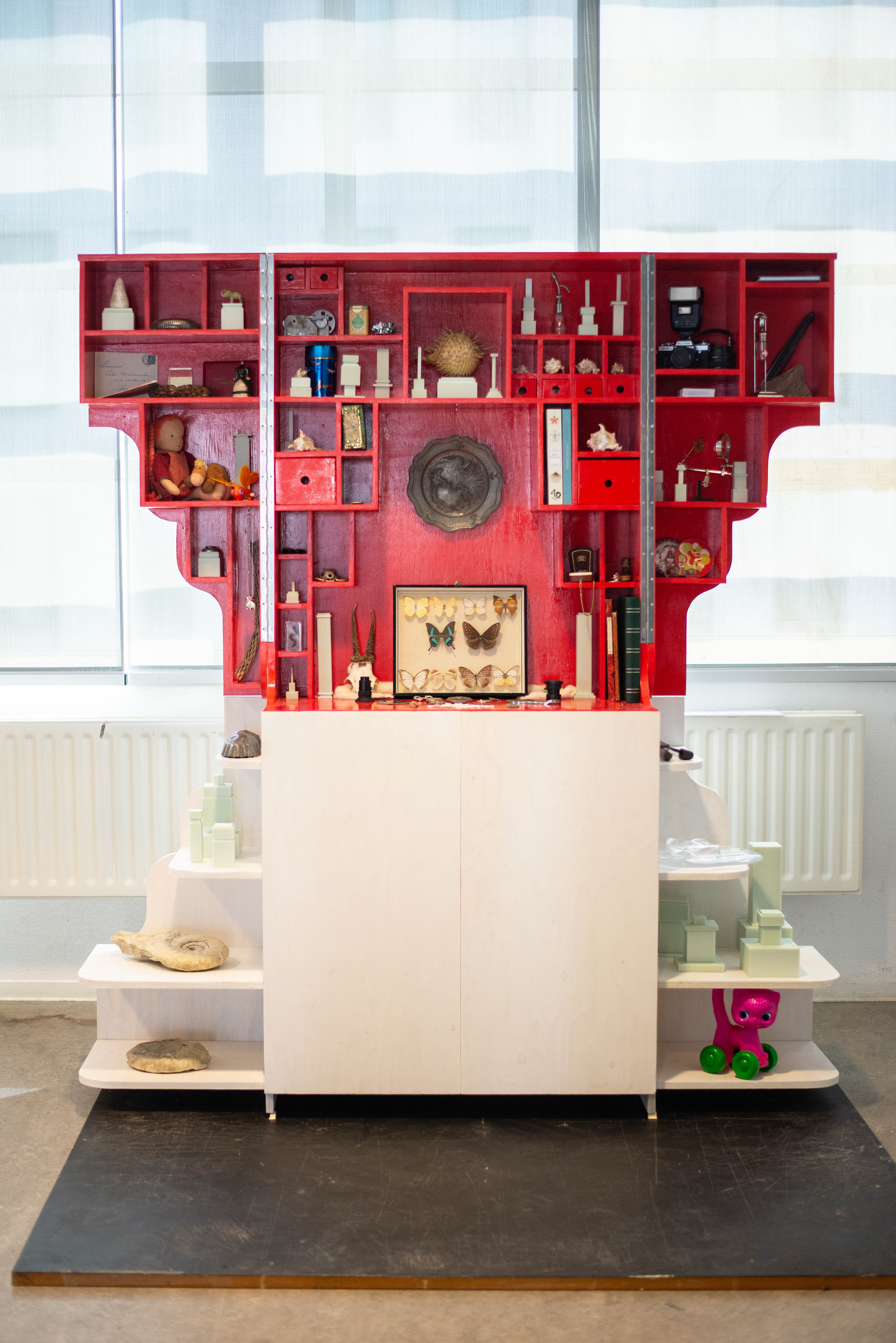 The specially designed dual-purpose cabinet is intended for both the storage and display of cherished objects. This cabinet allows individuals to arrange their items in a way that resembles a personal home altar, creating a sacred space for their collections. Having this distinct space gives value to the collection and protects objects from getting lost or breaking. When opened, the cabinet transforms into a display case, giving users the choice of sharing the significance of their objects with others or keeping them privately treasured.