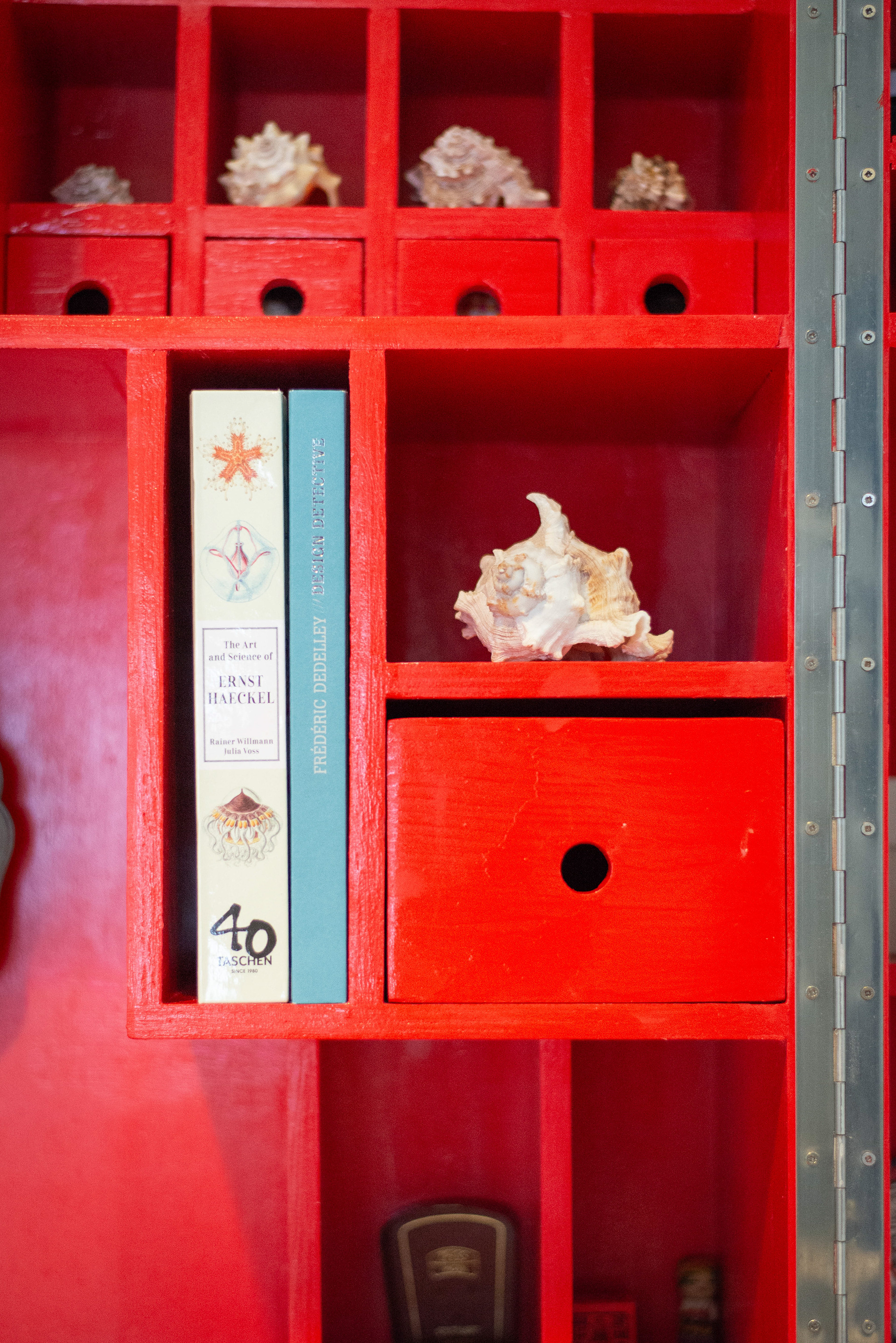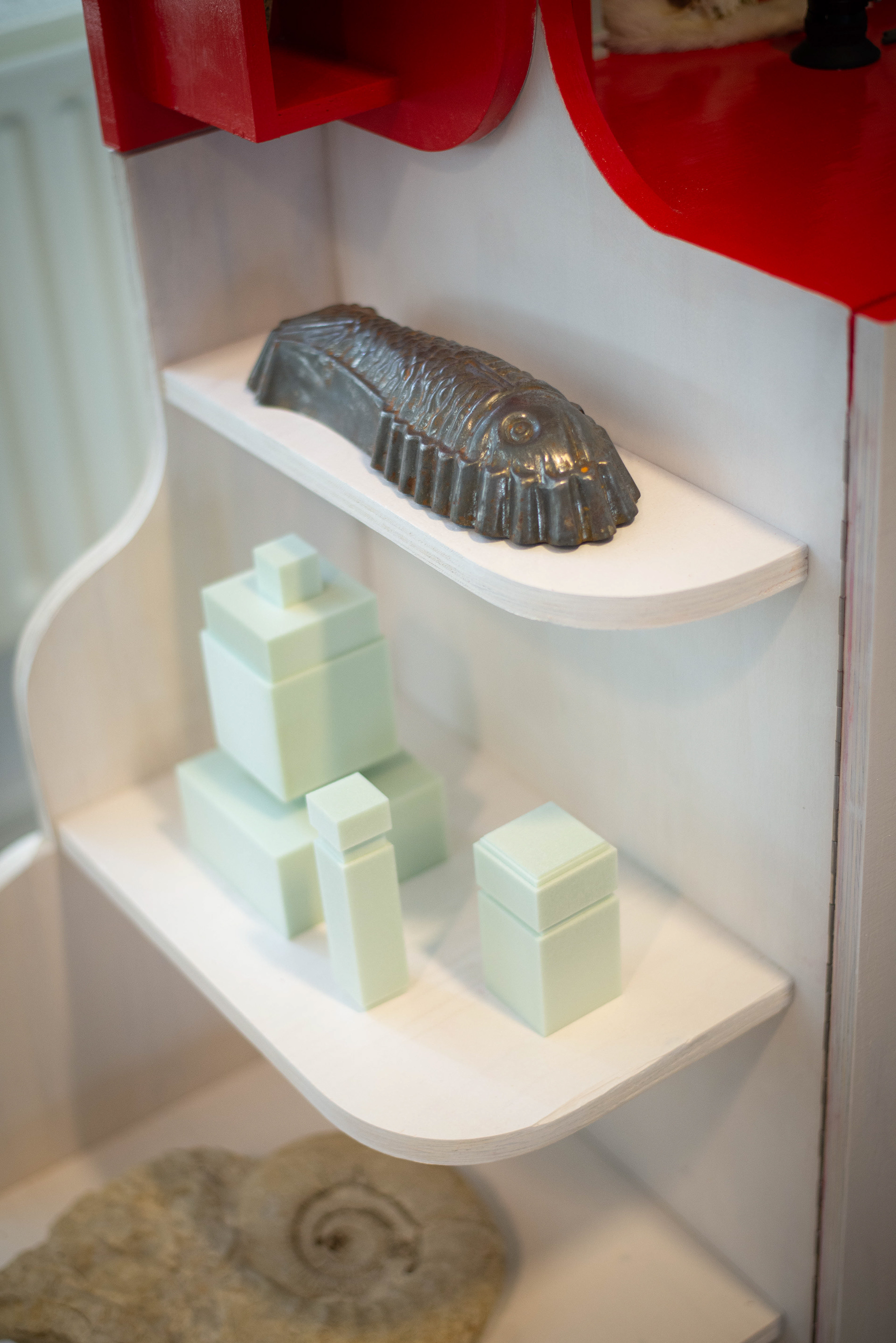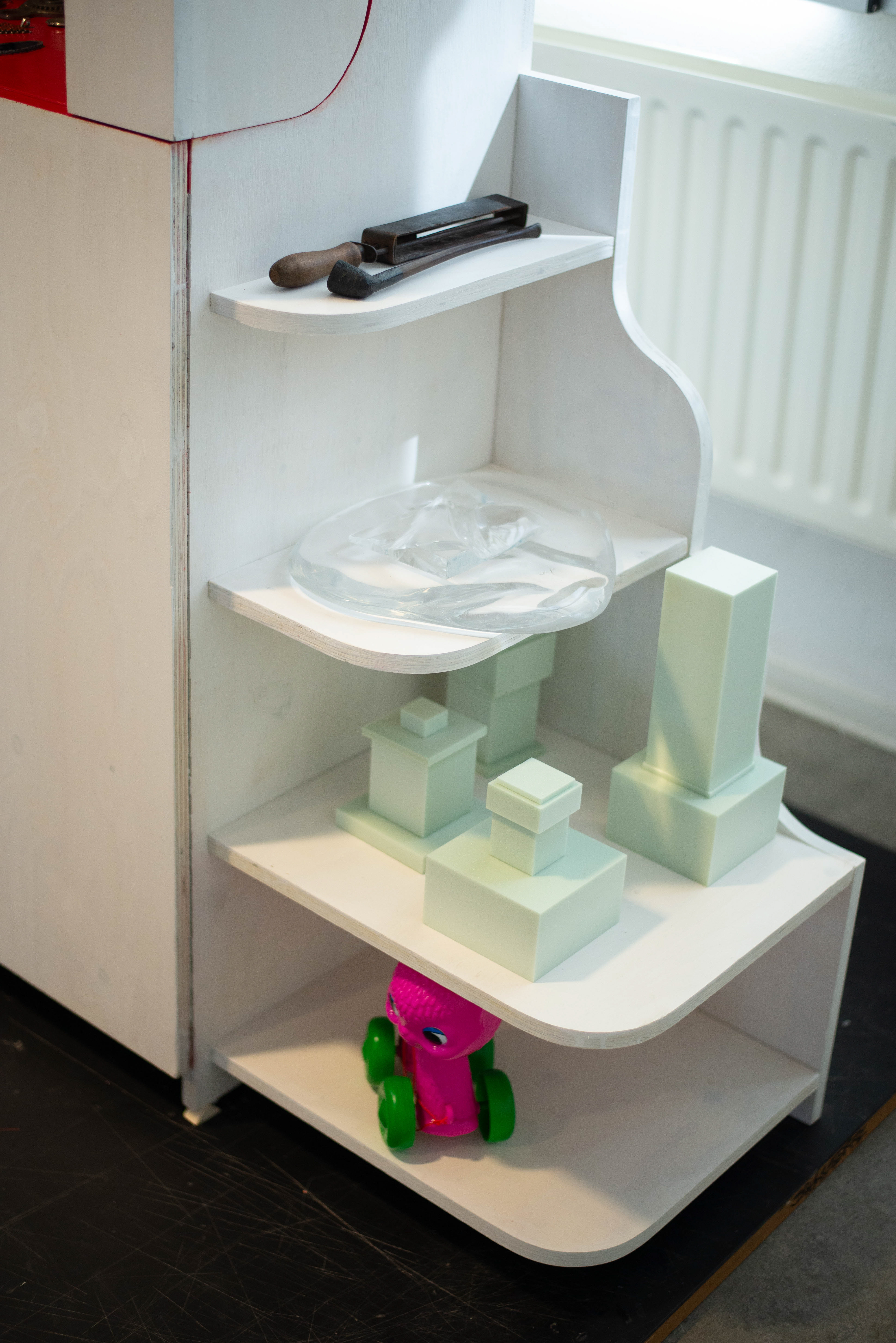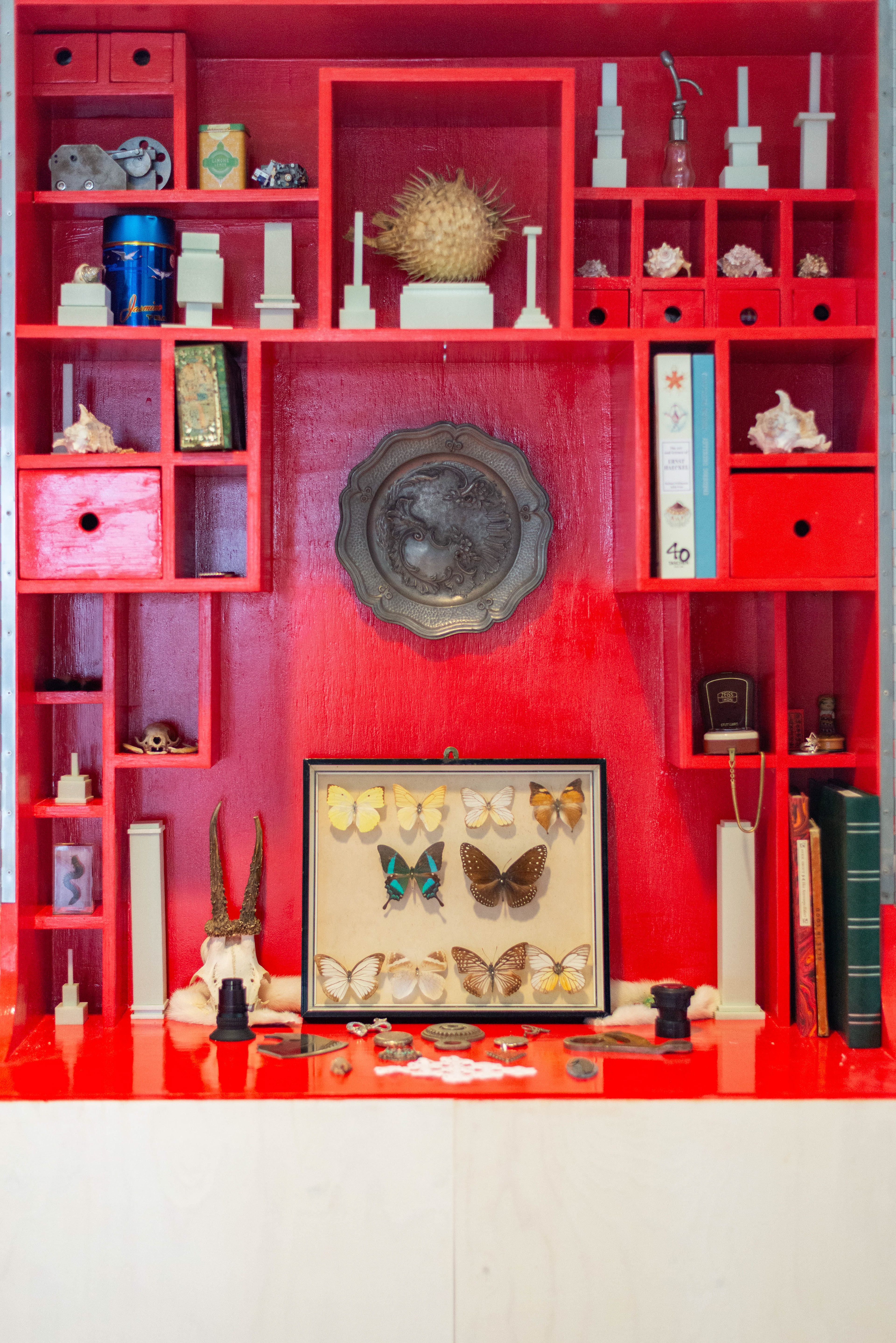 The specially designed dual-purpose cabinet is intended for both the storage and display of cherished objects. This cabinet allows individuals to arrange their items in a way that resembles a personal home altar, creating a sacred space for their collections. Having this distinct space gives value to the collection and protects objects from getting lost or breaking. When opened, the cabinet transforms into a display case, giving users the choice of sharing the significance of their objects with others or keeping them privately treasured.